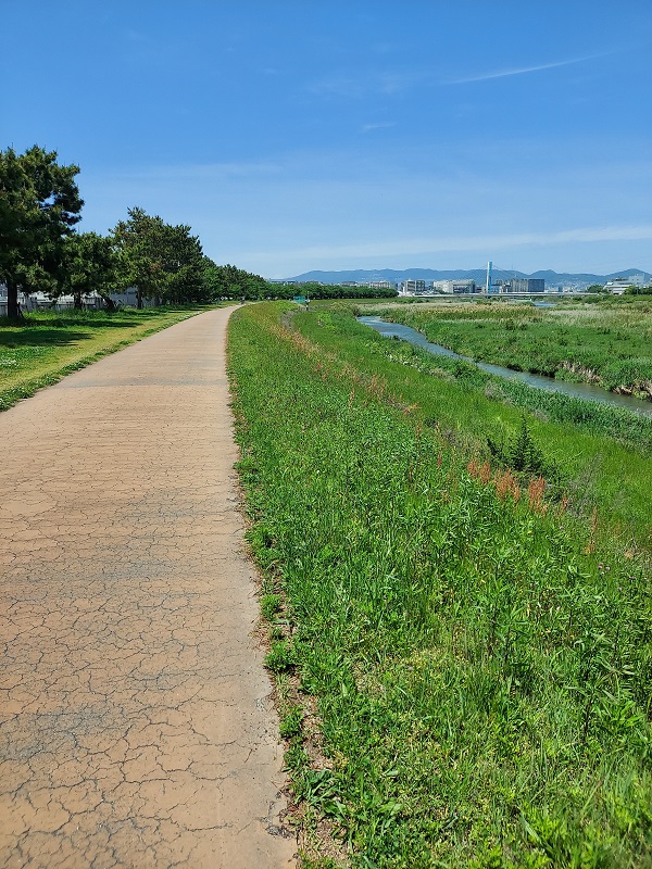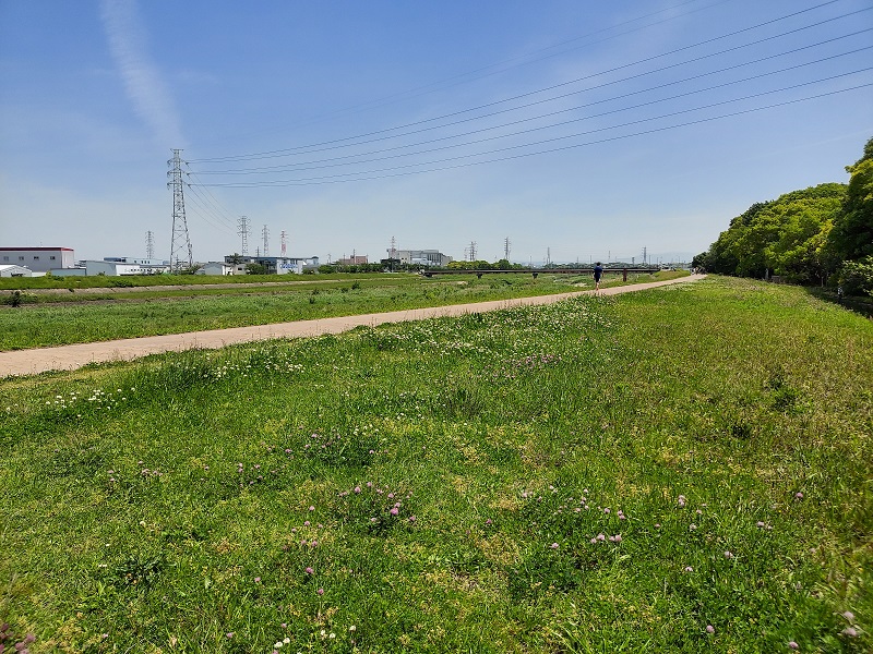 土手を上がれば猪名川。自然がいっぱいですね。川の向こうは大阪府。