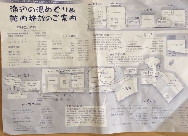 このホテルと隣のホテルニューアワジ、一番遠いけどめっちゃ豪華な淡路夢泉景、そしてスパテラス水月でひとまとめ。昔はそれぞれ違うホテルやったんやろな。
