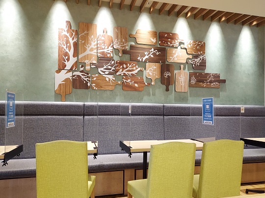 店の奥にはソファー席。壁がオシャレなアート。まぁまぁ広めのお店。