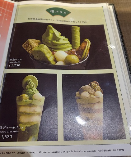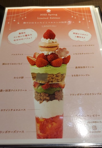 外に出てた【艶やかはるいちごとマカロンの抹茶パフェ】が気になるけど、ちょっと大きいかな?