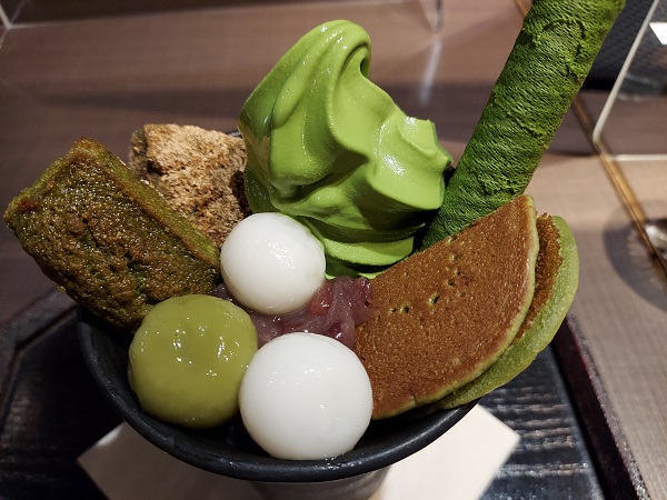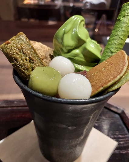 抹茶のソフトクリーム、白玉団子、ミニ三笠、抹茶クッキー、抹茶わらび餅、抹茶ゼリー、抹茶スポンジ、あんこ…。和スイーツがてんこ盛り!これでもか!ってくらい(^-^)