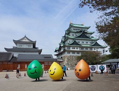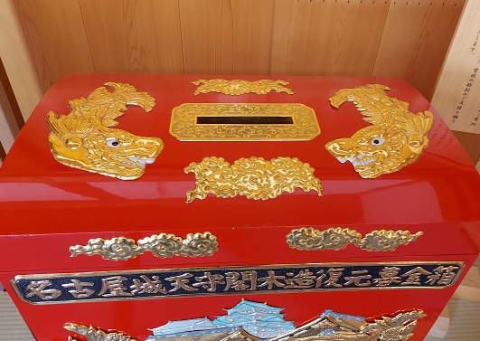 なんかスゴイ箱がある!って思ったら、名古屋城天守閣を復元するための募金箱やった。今は耐震性がたりないから、上がれないもんね。