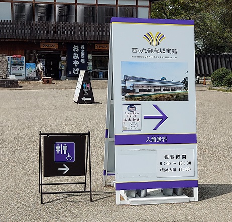 おみやげ物屋さんがあったけど、その前に「西の丸御蔵城宝館」の看板。