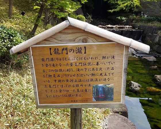 途中さっきの「龍門の滝」のそばまで行けます。滝の下にある尖った岩が、鯉を表してるとか。
