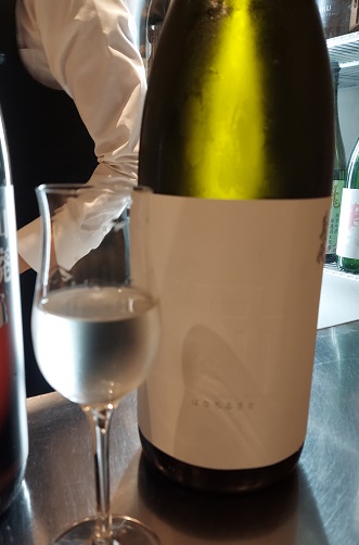店長のオススメでお願いしてたけど、これはラベルが真っ白!いや、白地に白で模様があるけど、パッと見、真っ白。「はなちるさと」という、このお店の社長が作ったお酒らしい。つまり、ここでしか飲めない!ワインみたいにフルーティー。