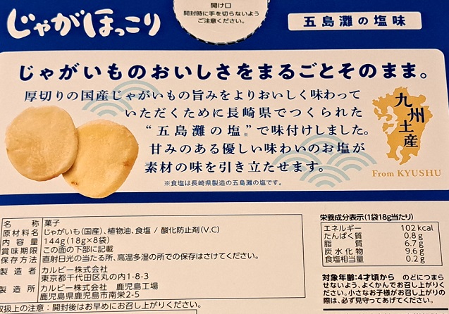 ジャガイモは「国産」としか書いてないけど、食塩は長崎県五島灘の塩を使ってるらしい。