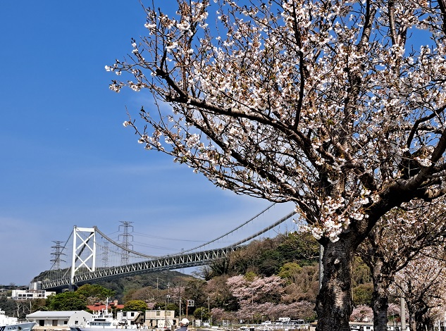 桜の残る遊歩道を通って、関門海峡の橋をくぐる。坂道もあったけど、電動アシスト自転車で楽々(^-^)