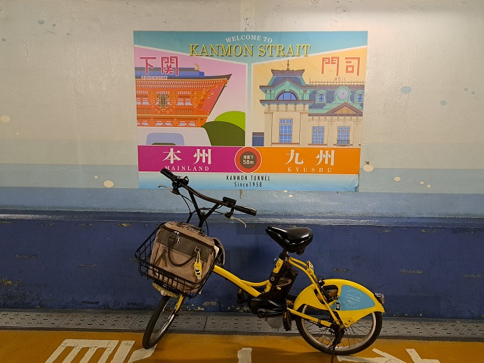 門司港駅前でレンタサイクルを借りて、関門海峡を歩いて渡ってきた。