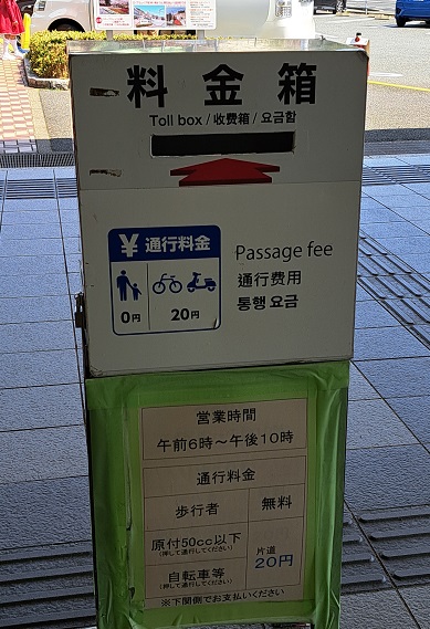 料金は無料だけど、自転車は20円。下関側に着いたとき、箱に入れるようになってた。