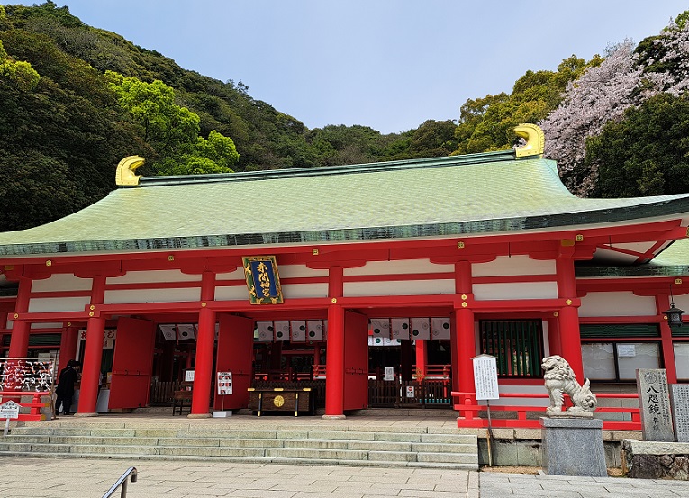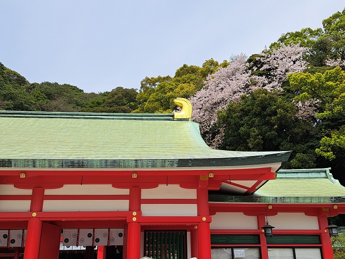 階段を上がって本殿へ。あ、まだ桜が咲いてる(^.^)みどり色の屋根瓦と金のシャチホコ、桜と似合ってるやん(^-^)