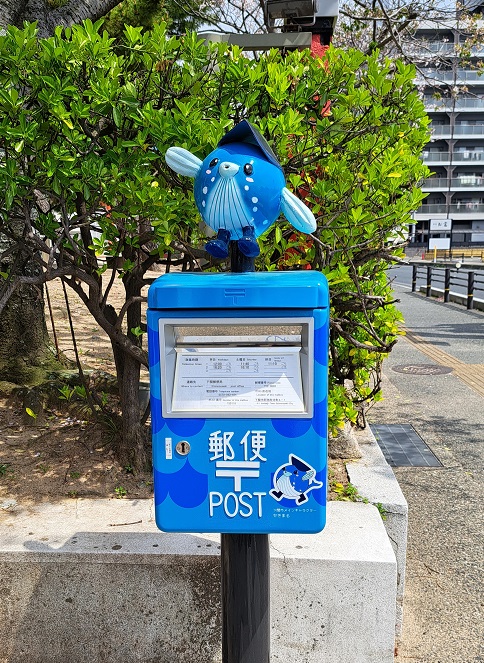 鳥居の横には青いポスト。ポストの上には、青いふぐ(((^^;)この辺のゆるキャラ?