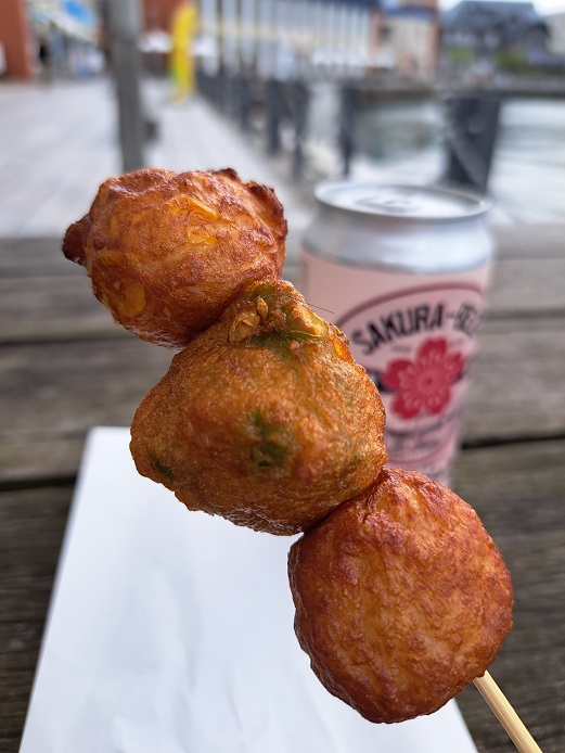 【門司港限定ロシアンさつま揚げ】は、団子三兄弟みたいなさつま揚げで、チーズとカレーと、激辛の味。どれが激辛か分からないからロシアンルーレット方式ね。