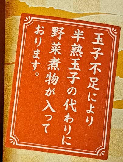 本来なら野菜の煮物じゃなくて、半熟玉子が入ってたらしい。玉子不足がこんなトコにも(-_-)