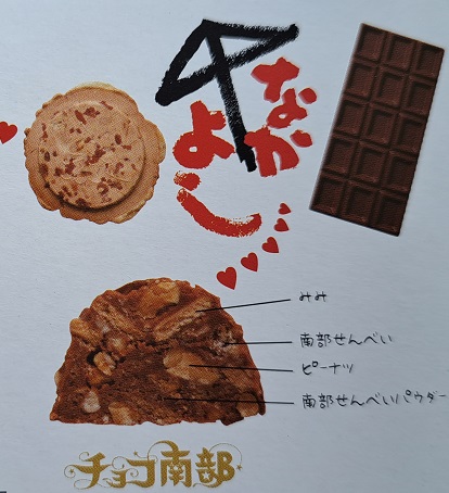 パッケージの裏みたら、チョコの中に南部せんべいの破片が入ってる。ピーナッツも入って、クランチチョコとはちょっと違う?