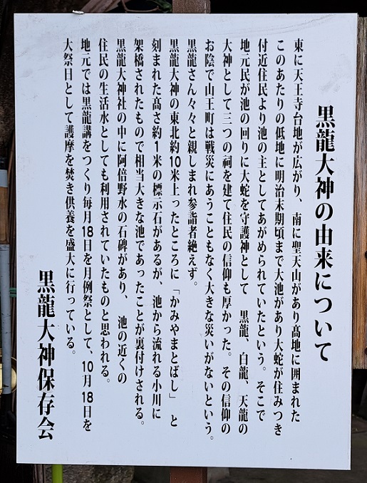 説明書によると、天王寺には昔、大きな池があって、大蛇が住み着いて、池の主として崇められていた。そこで住民が、池の周りに『黒龍』『白龍』『天龍』の3つの祠を建てて信仰していた。そのおかげで、戦災にもあわず、大きな災害もなかった。