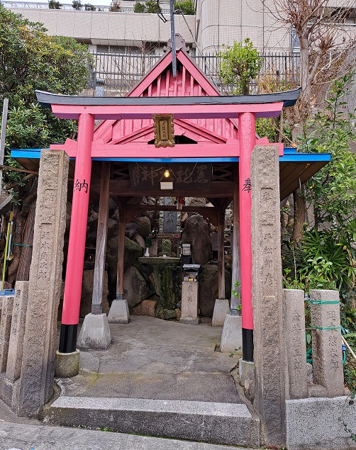 急な坂を降りていくと、大きなマンションの入り口に、朱塗りの鳥居がある。これが『黒龍大神』の祠。小さいけど、掃除も行き届いて、キチンと管理されている。電気まで着いてる。