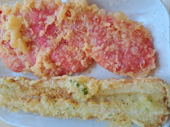 まずは、【ちくわ天】140円。そして【鶏天】にしようかと思ったら、【紅しょうが】140円がある!紅しょうがって久しぶりやん。これをチョイス。