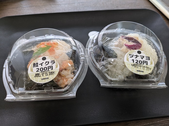 △印と◯印があって、値段が違う。三角おにぎりと、丸いおにぎりで、大きさが違うらしい。丸い方が小さめで200円。2つは食べたいから、小さい方でお願い。