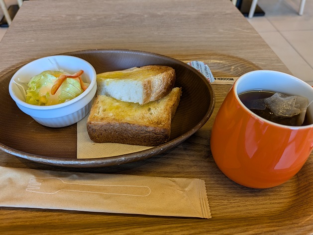 トースト、サラダ、紅茶。紅茶はティーバッグ。そこは期待してない。しかし、アイスでお願いするの忘れたなぁ💦