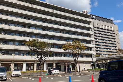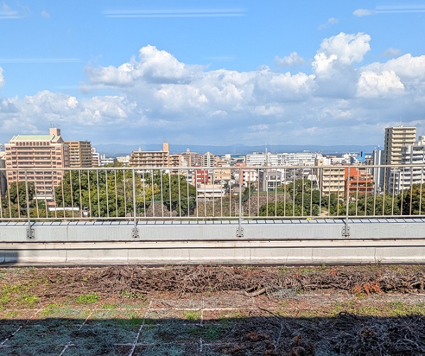 北側は大分城址公園がかすかに見える。かすかにってのは、窓の外が広い屋上になってて、景観はその向こうだから。