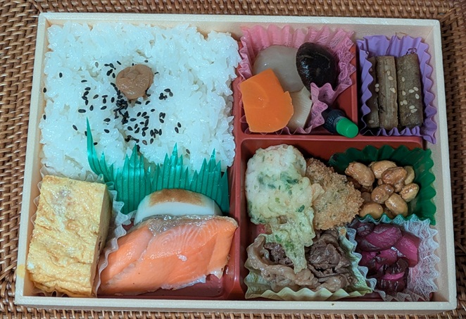 中は、標準的な幕の内。玉子焼きやら鮭、野菜、揚げ物、肉と、いろいろ入って健康的(^^)シニアにはこっちの方が良い。