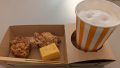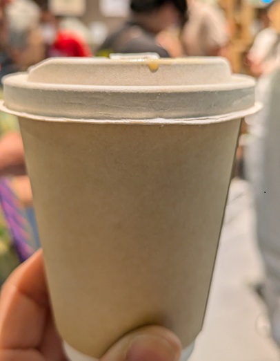 紙コップでの提供。ミルクや砂糖はセルフ。なので、ミルク2つ入れたそのかわり、砂糖はなし。
