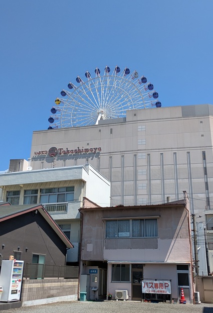 駅の観覧車も見える。バスも来るってことは、団体旅行も来るんやね。