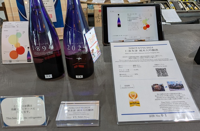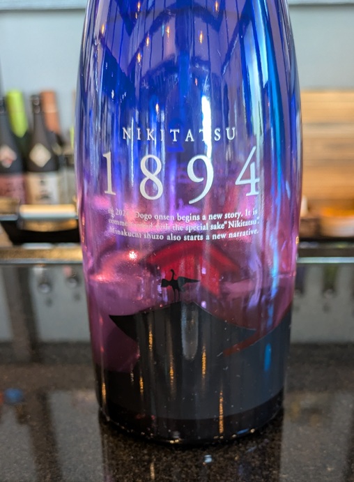 紫のボトルは、純米大吟醸濃醇甘口。去年の道後温泉本館リニューアルオープンを記念して作られたお酒。リニューアルオープンした2024と、本館の建物。裏は、道後温泉がオープンした1894と本館の建物。