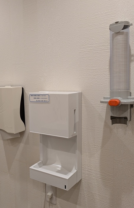 コップは紙コップ提供。ペーパータオルに、ハンドドライヤー。