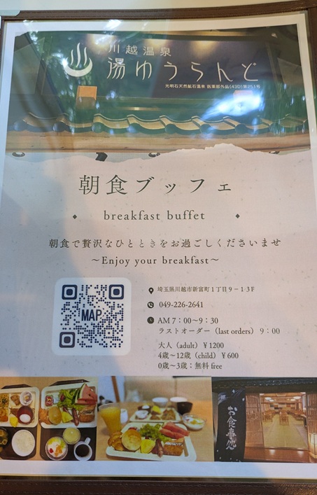 少し離れたところにあるスーパー銭湯では、朝食ビュッフェもある。