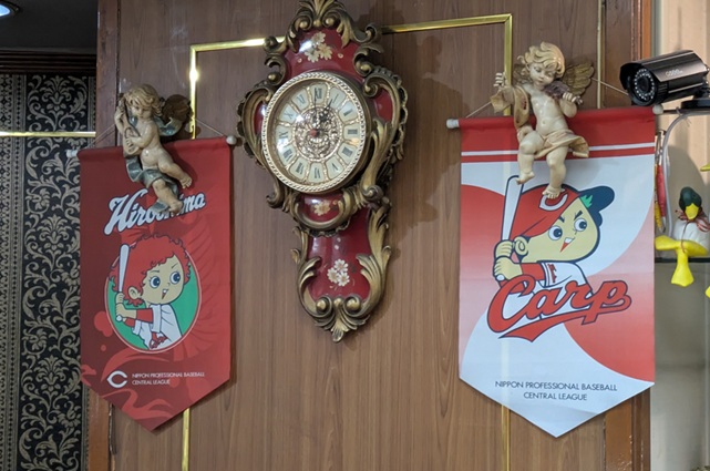 2階にはアンティークな飾り物も。ちょっとしたソファーやテーブルもある。カープに関する資料も見られる。