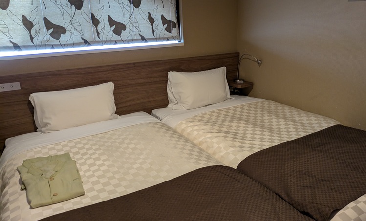 間違えて喫煙室を予約してたけど、空きがあったので、禁煙室に変更してくれた。ツインはツインでも、ハリウッドツイン。ベッドがピッタリくっついてるヤツ。小さい子供と添い寝なら、落ちる心配なくていいけど(^_^;)