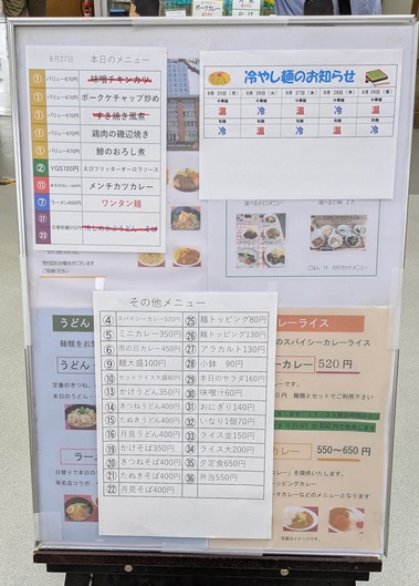 時間は12時半。こういう役所食堂って、早く行かないと定食とかは売り切れるんよね。でも行ってみると、ほとんど残ってた。