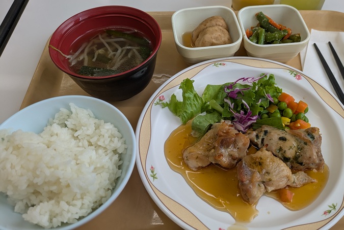 カウンターで小鉢を2種類取る。いろいろある中で、インゲン豆とにんじんのごま和え?と、がんもどきを選んでトレーに乗せる。スタッフさんにチケット渡して、ご飯と味噌汁を受け取り、続いて【鶏肉の磯辺焼き】が出てくるのを待つ…つもりが、スタッフさん「どうしました?」