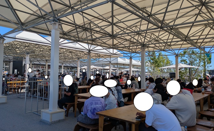でも、このあたりには椅子テーブルがたくさんある。たくさんあるけど、日陰の席はほとんどない!前回来た時はガラガラやったのに…(>_<)でも、なんとか見つけて陣取る。