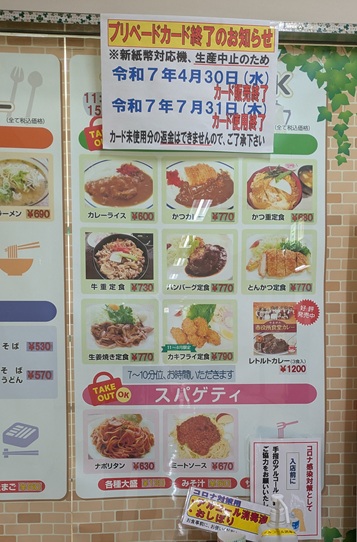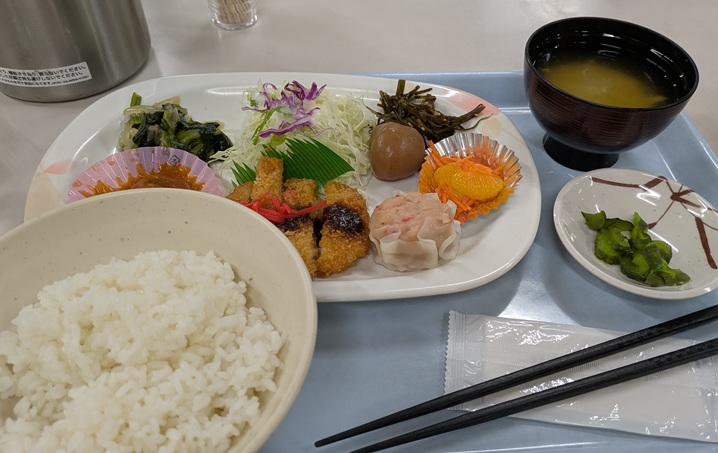 自販機でチケット買って、中に入る。セルフで受け取るシステム。12時前だから、まだガラガラ。すでにセットされてるお皿を受け取り、ご飯と味噌汁も受け取る。