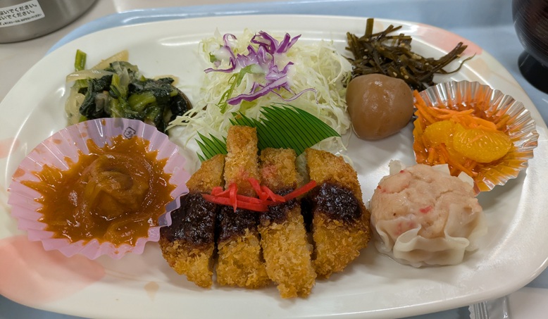 左上から時計回りに、小松菜?の和え物、キャベツサラダ、昆布の佃煮と玉コンニャク、ニンジンラペみかんのせ、エビシュウマイ、メインのとんかつ…最後のが何か分からんかった。何かのトマト煮込み。美味しかったけどね