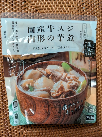 『国産牛スジ山形の芋煮」720円。ちょっと「無印良品」みたいなパッケージ。