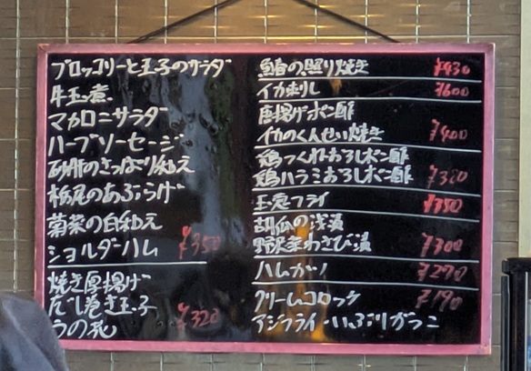 忙しそうだし、カウンターの上はおばんざいが並んでるから、酒瓶撮らせてとは言いにくい。メニューの説明読みながらいただく。