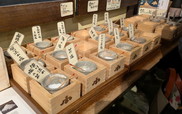 なんと、塩のコーナーもあった。さすがに塩だけで飲めるほど、ワタシは酒飲みではない(^^;)でも、塩もいろいろ並んでて、舐め比べもできる。