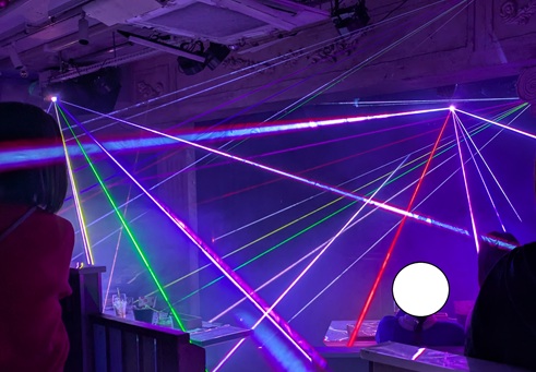 そして、場内は暗くなり、レーザー光線も!このへんからは、ご飯食べるのは難しくなる。だからこれまでに食べとこうね。