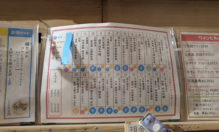 「本日の銘柄」が25種類。毎日変わるのかな?ひとつづつ、辛口とか甘口とかのシールが貼ってある。値段は50mlで400円、90mlで600円、180mlで900円。