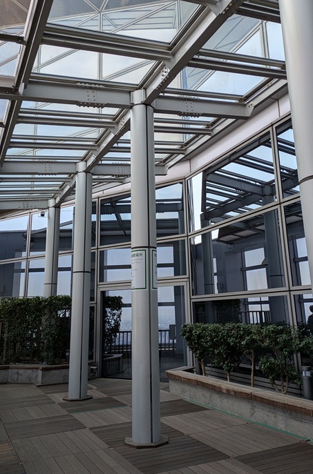 景色見てても、なんか肌寒いんよね。屋根はあるけど、完全な室内ではない!後付けで作った感じ。だから「展望フロア」じゃなくて、「展望テラス」なんや。冬は寒くて、夏は暑いやろな。