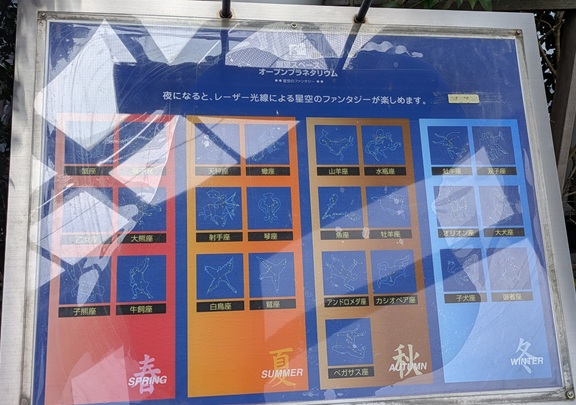 夜になると、オープンプラネタリウムとして、レーザー光線で星座を映したりするみたい。へぇ〜、ちょっと観てみたいやん