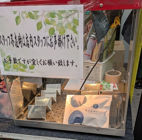 スタッフさんがいないから、店のぞいて声かける。なんのことはない、ここは牛タンの『利久』さんやん。カレーパンや肉まんもやってるとは。