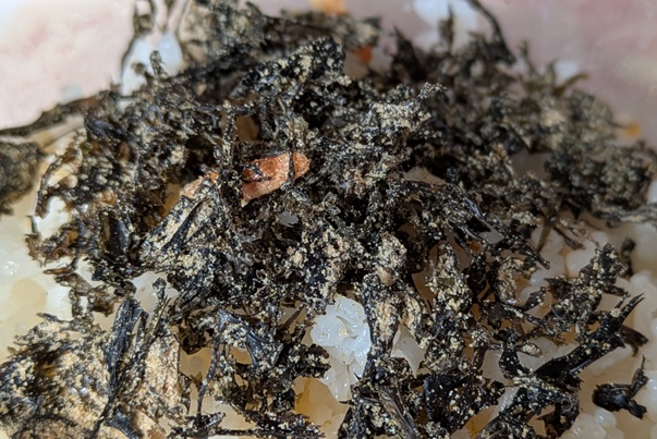 【FURIKAKE バラッツ海老豚骨味噌】も試してみる。これは「ふりかけ」ということなので、ご飯を用意する。