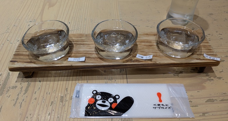 今回もそれでいいけど、少し前から気になってる「球磨焼酎」の【3種飲み比べ】950円がある。最近は焼酎もよく飲むようになったんよね。健康的やし(^-^)
