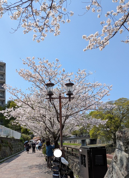 平日だけど、たくさんの人が花見に来てる。川沿いに屋台も出てるけど、今はお腹いっぱい