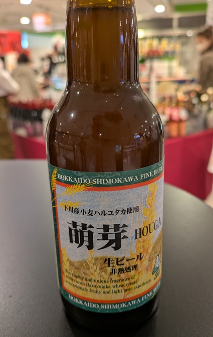 【萌芽】。旭川の地ビールみたい。レジでお金を払って、栓抜いてもらう。「王冠入りますか?」って聞かれた。持って帰る人もいるんやて。写真は撮りたいから、王冠もいただく。