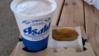 万博でちょっと一杯(^^;)『つくもうどん』の【天ぷらビールセット】がなかなかお得感あり。ビールにエビ天と鶏天ついて1,500円。冷え冷えビールに揚げたて天ぷらで、ちょっと一息いれようか(^-^)